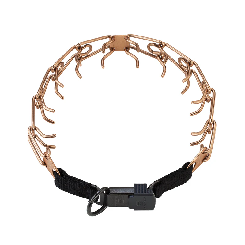 אם אתה רוצה פתרון בטוח ואמין שישמור על הפרווה של כלבך, חברת HS תכננה דגם של קולר דוקרנים העשוי מקורגן (Curogan) עם אבזם הננעל בלחיצה.